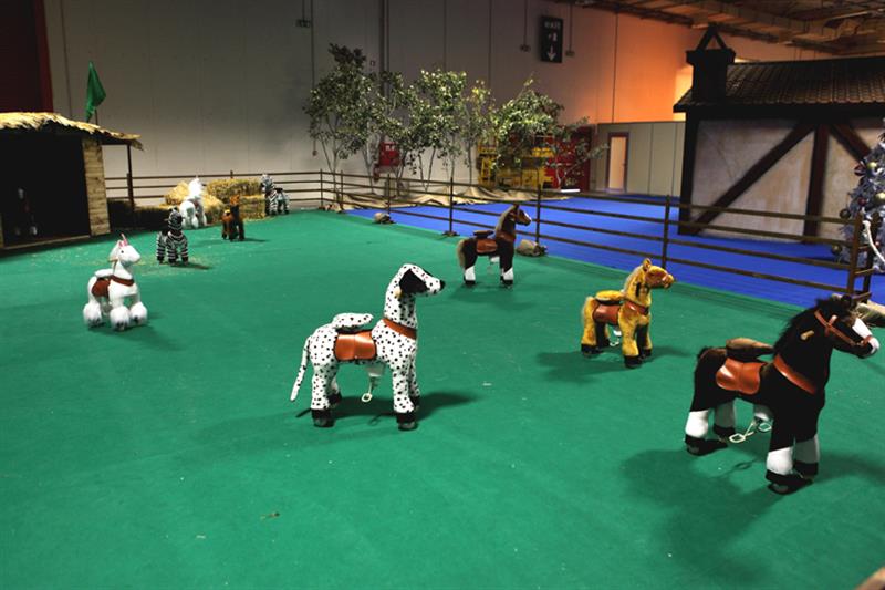 The horses move easily on smooth or carpeted floors, but not on soil or grass.